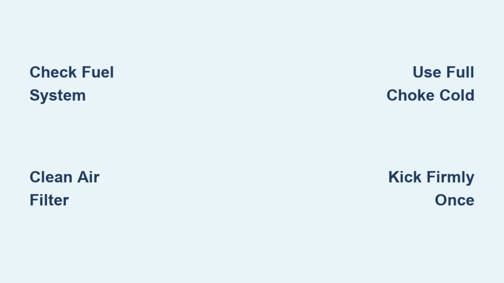2-stroke engines require a different kick technique than 4-strokes due to their simpler ignition timing. Begin by slowly kicking through the stroke to feel for the compression point—this is where you’ll feel significant resistance as the piston approaches top dead center. Once you identify this point (usually about 1/3 through the kick stroke), pull the kickstarter back slightly to reset, then deliver one firm, complete kick all the way through. Never “feather” the kickstarter or use short kicks, as this prevents the flywheel from reaching sufficient RPM for proper ignition. For cold starts, use full choke and kick with authority—2-strokes need that initial burst of RPM to fire properly.